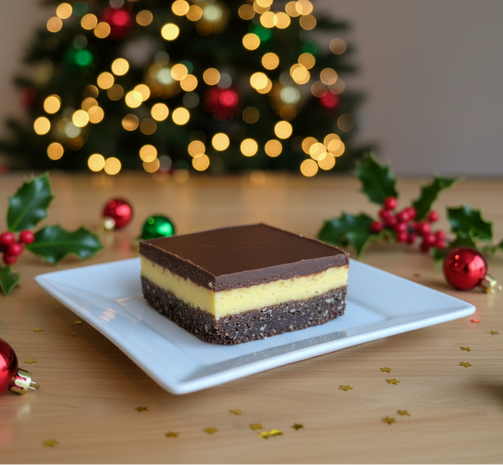 Our decadent Nanaimo bar has a coconut brownie base, custard buttercream middle, topped with a layer of chocolate.