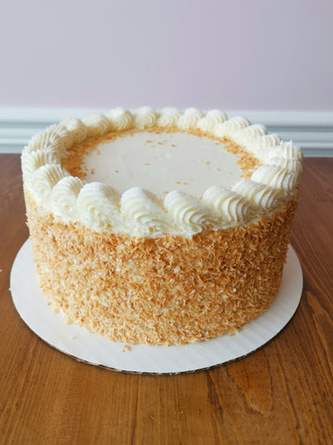 Our classic vanilla cake with coconut buttercream, toasted coconut and 3 layers of filled with dulce de leche.
